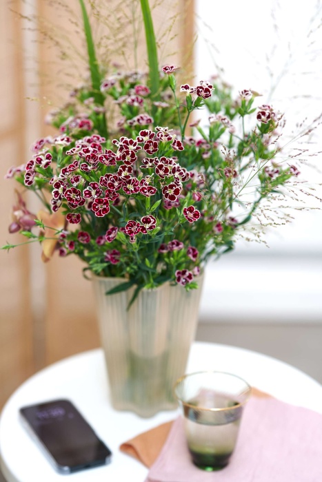 Meet Dianthus Sparkz® Raffine Petit Faye, a variety that instantly catches the eye. Its deep burgundy blooms, delicately accented with fuchsia speckles and white edges, bring a luxurious yet playful look to any bouquet. Thanks to its extra-long stems, Petit Faye is perfect for tall vases and creative floral arrangements.